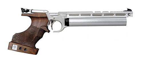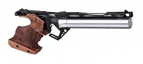 Mit 950g ist die Feinwerkbau P8X eine leichte Luftpistole mit mechanischem Abzug. Sie ist auch erhältlich als Kurzversion mit sogar nur einem Gewicht von 875g. Eine stufenlos längenverstellbare Visierlinie und ein anatomisch geformter 3D-Formgriff, der verdreh- und schwenkbar jeder Handstellung angepasst werden kann, sind die Vorzüge dieser Luftpistole.
